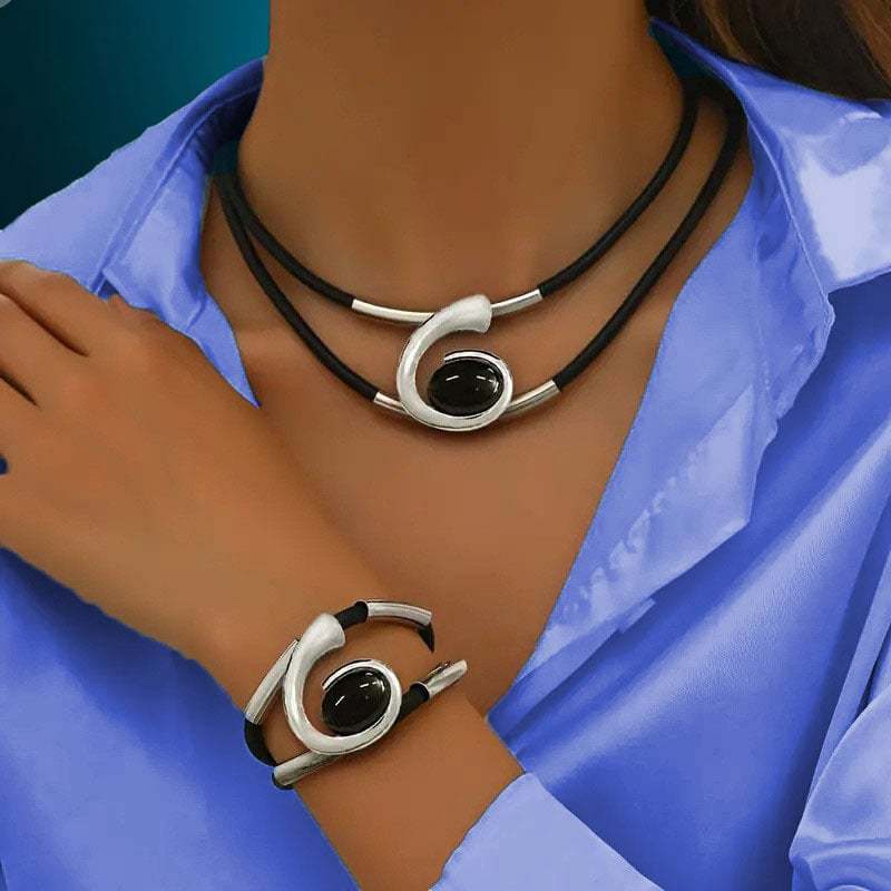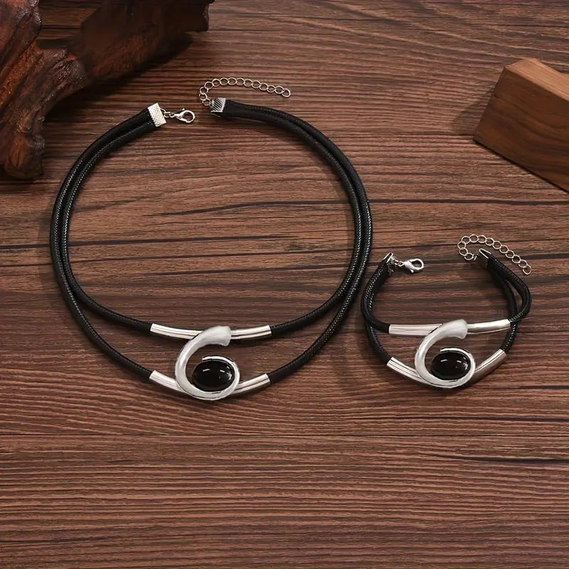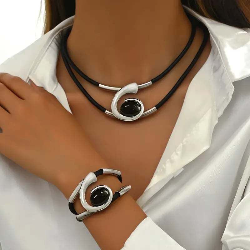 ✨✨Featuring a bold. artistic swirl with a glossy black centerpiece. the necklace and bracelet work together to add strength. style. and sophistication to your outfit.