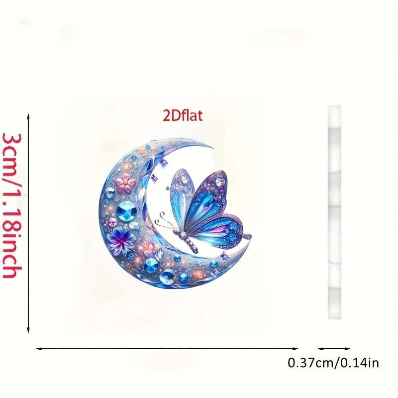 A whimsical crescent moon cradles a detailed butterfly in rich shades of blue and violet. accented with floral patterns and gem-like shimmer for an ethereal look.