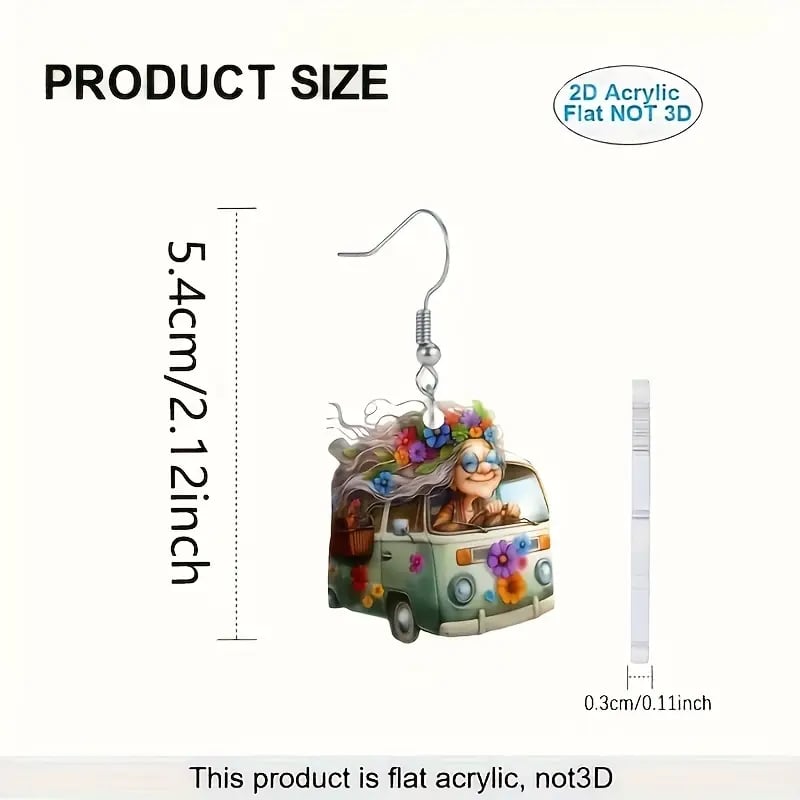 Designed with vibrant details. each earring features a cheerful grandma cruising in her flower-decorated retro van. symbolizing freedom. happiness. and living life to the fullest.