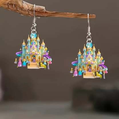 These earrings feature a beautifully detailed castle with bright colors and intricate accents. They instantly bring a playful yet elegant charm to your style.