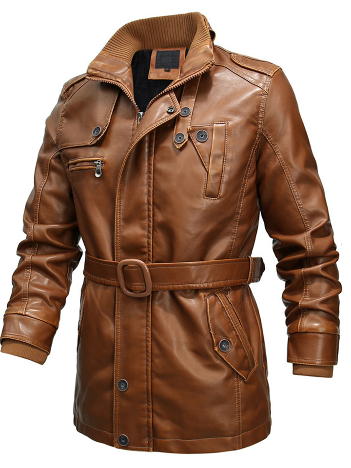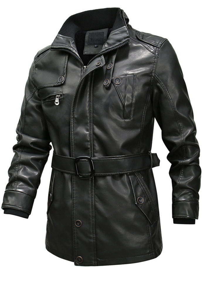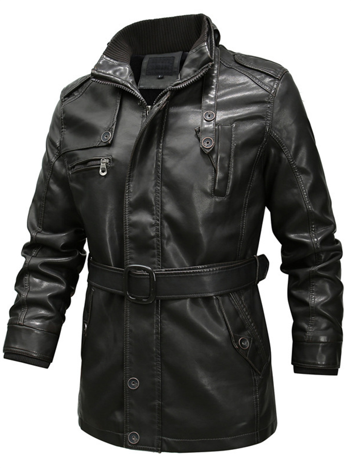 Men's Casual Solid Color Biker Washed Stand-up Collar Leather Jacket PU Leather Jacket Zipper Insert Pockets Belt Padded Jacket