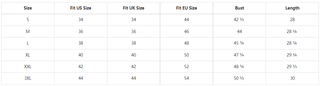 Fit US Size: S:34;M:36;L:38;XL:40;XXL:42;3XL:44