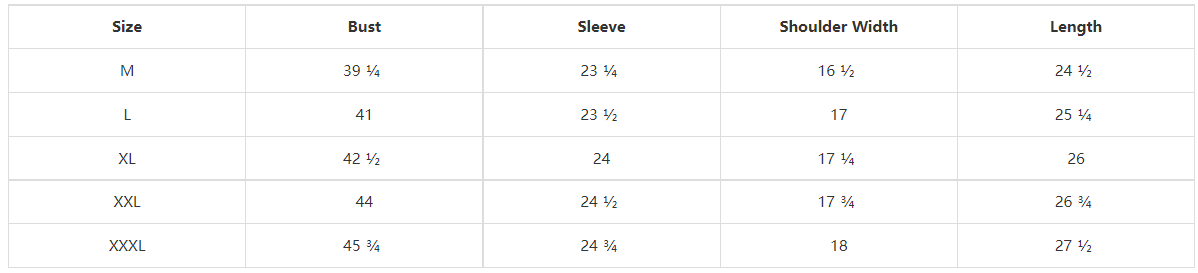 Shoulder Width (cm): M:42;L:43;XL:44;XXL:45;XXXL:46