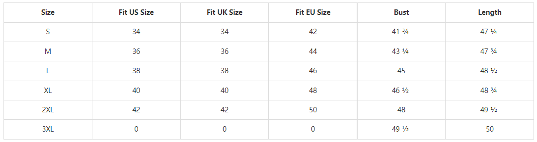 Fit US Size: S:34;M:36;L:38;XL:40;2XL:42